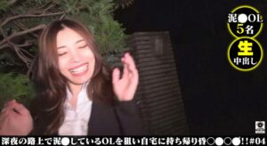 深夜の路上で__しているOLを狙い自宅に持ち帰りハメまくった記録。最終電車の直後、路上で_いつぶれたOLが今夜もまたいる。「ほらほら飲み過ぎたらダメじゃないですか、」心配して優しく介抱するそぶりを見せ、俺は__OLたちを自宅に連れ込みハメまくっていまいた。ナンパや合コンより手っ取り早いんですよ、カメラも回しているのでその全記録映像を今回公開しますよ。OLさんたちはストレス社会にさらされお酒で憂さ晴らし!__OL各5名収録。【__(1)】巨乳OLさんも上司?への愚痴を漏らしていたかと思ったらそのまま_落ちw次の美人さんは途中で目覚めて「誰だ!お前!?」と言いながらこちらも再び_落ち、結果おいしく頂きました。【__(2)】ハイテンションの今どきなOLさん!いいお酒を飲まれましたお次もスタイル抜群のいい女。介抱するふりして服を脱がす手口がプロです。【__(3)】千鳥足の綺麗なお姉さん!お怒りモードから___落ち。美白パイパンマ○コに生中出し!本作品【__(4)】スレンダー美女の不思議ちゃん。_っぱらってちょっと何言ってるかわからないのでとりあえずヤッときましたw優しさと介抱のお題は生中出しでご精算。本日もご馳走様でした。